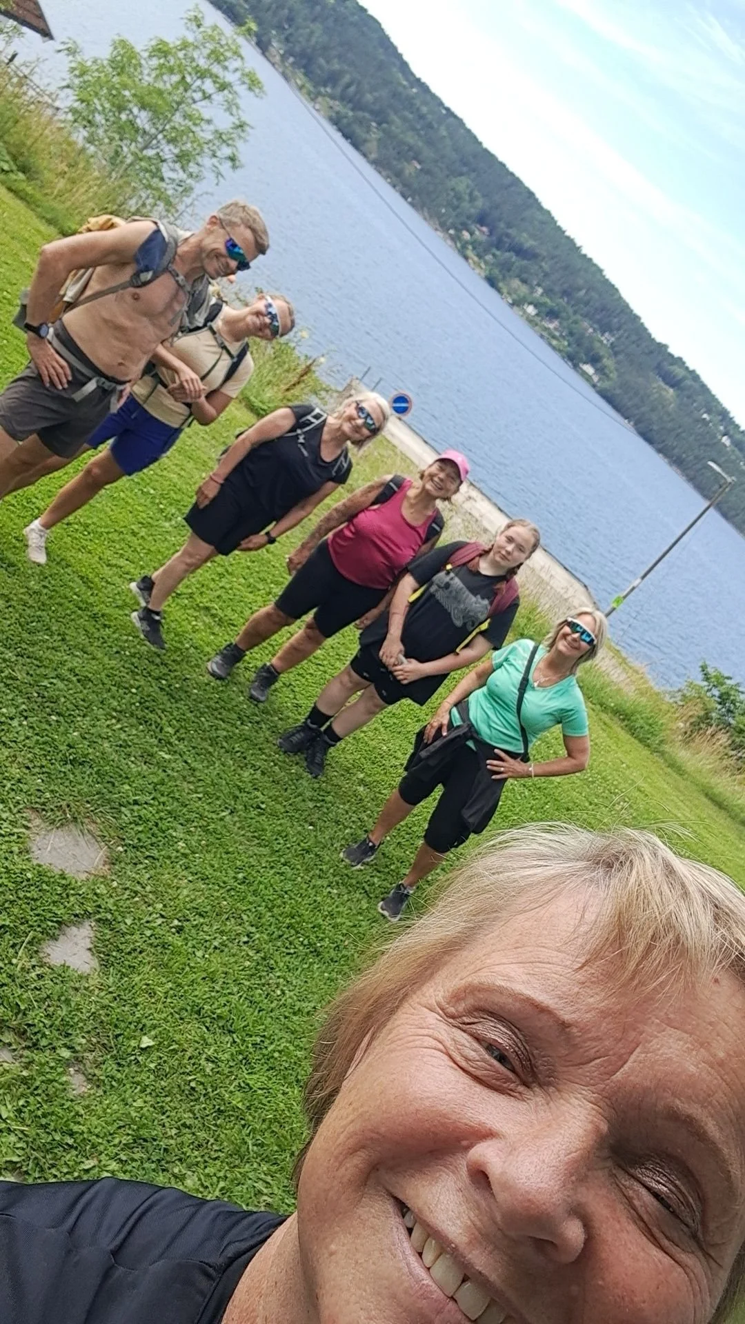Vi startet ved Blylaget Brygge med ryggsekker pakket med nistepakker, drikke og badetøy. Som alle andre dager denne sommeren var det veldig varmt, men vi la i vei så svetten rant. Deilig var det derfor å kunne kjøle seg ned med bading underveis ved Sørby Brygge og Hellviktangen.